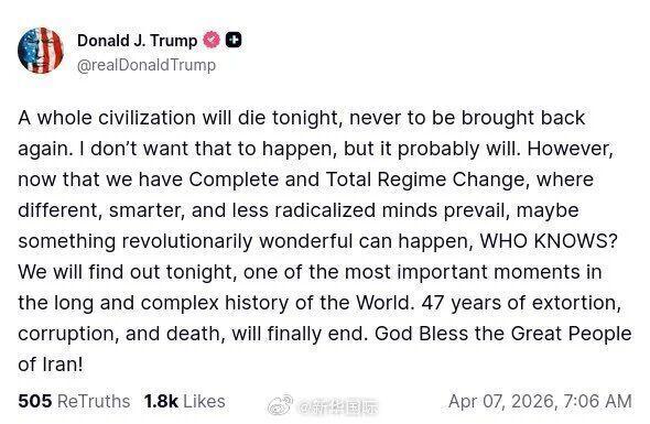 数小时前,特朗普还发帖渲染他的最后通牒:" 今晚,整个文明将消亡,永不复返。我不愿这样的事情发生,但它或许会发生 ……"