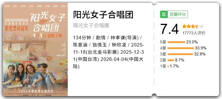 这两年大家都在呼吁,对女性题材多一点宽容," 先上桌再挑菜 "。我想这也是观众能对《阳光》不吝溢美之词的原因。起码林孝谦有一句话说得没错:"(票房)结果证明,一群‘阿姨’还是有一片天。" 而这正是观众希望电影市场所正视的现实。