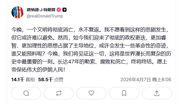 综合央视新闻等媒体报道,特朗普多次威胁伊朗称,达成停火协议最后期限是美东时间 4 月 7 日 20 时(北京时间 8 日 8 时),否则伊朗整个国家可能在一夜之间被彻底击毁。周二北京时间晚 8 点,他又在社交媒体上发文威胁伊朗称," 今晚,一个文明将彻底消亡,永不复返 "。