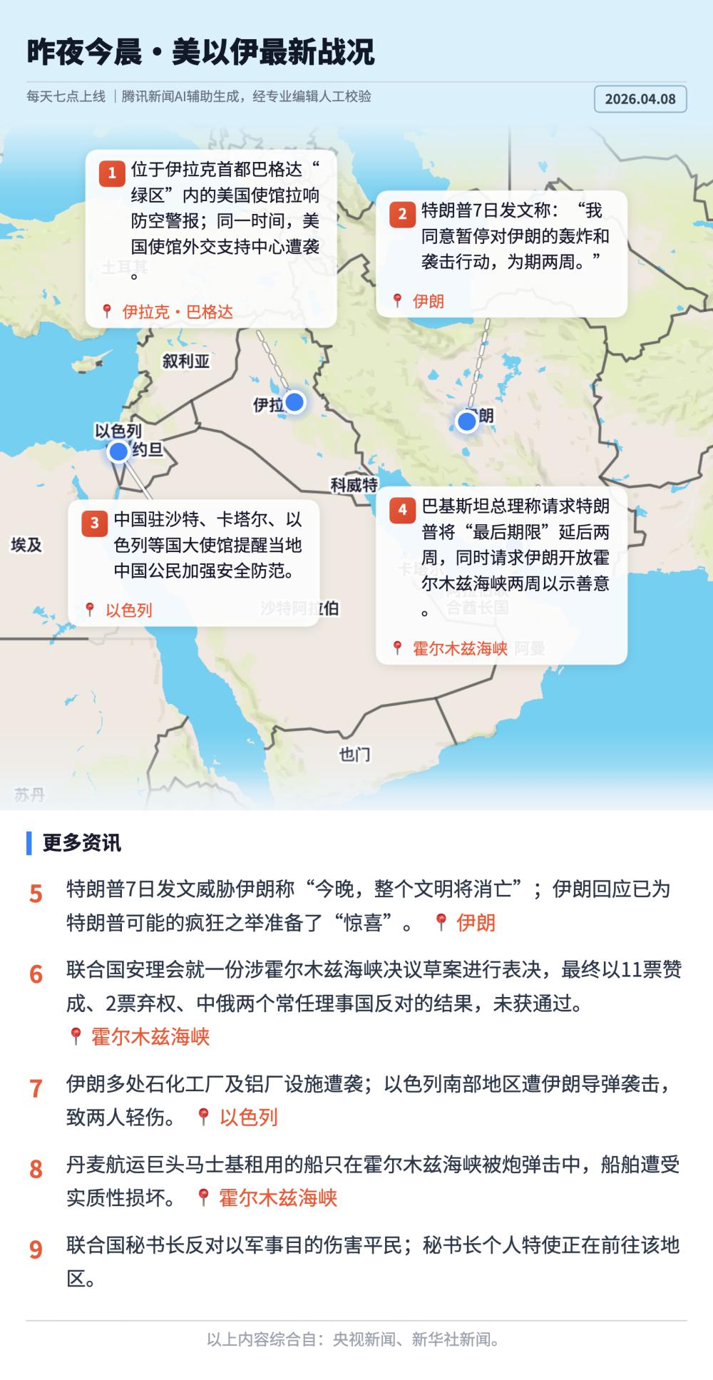 ①特朗普 7 日发文称:" 我同意暂停对伊朗的轰炸和袭击行动,为期两周。"