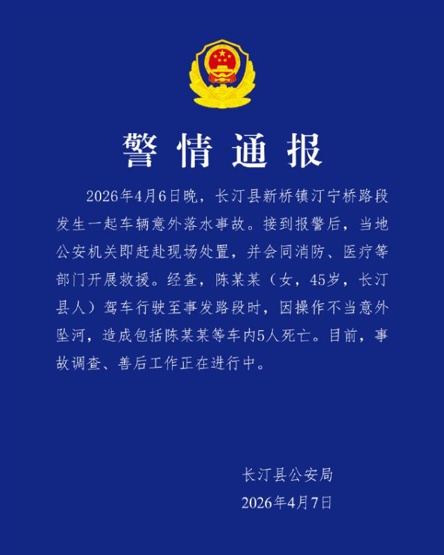 福建长汀县公安通报:2026 年 4 月 6 日晚,长汀县新桥镇汀宁桥路段发生一起车辆意外落水事故。接到报警后,当地公安机关即赶赴现场处置,并会同消防、医疗等部门开展救援。经查,陈某某 ( 女,45 岁,长汀县人 ) 驾车行驶至事发路段时,因操作不当意外坠河,造成包括陈某某等车内 5 人死亡。目前,事故调查、善后工作正在进行中。
