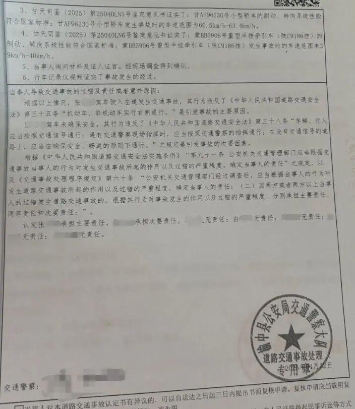 6 月下旬,白女士在护工的协助下从四川成都坐火车到甘肃兰州,请求张先生一家出来见面,张先生及其家人都未有见面。据榆中县公安局交警大队出具的道路交通事故认定书,事故为张先生承担主责,大车司机为次责。