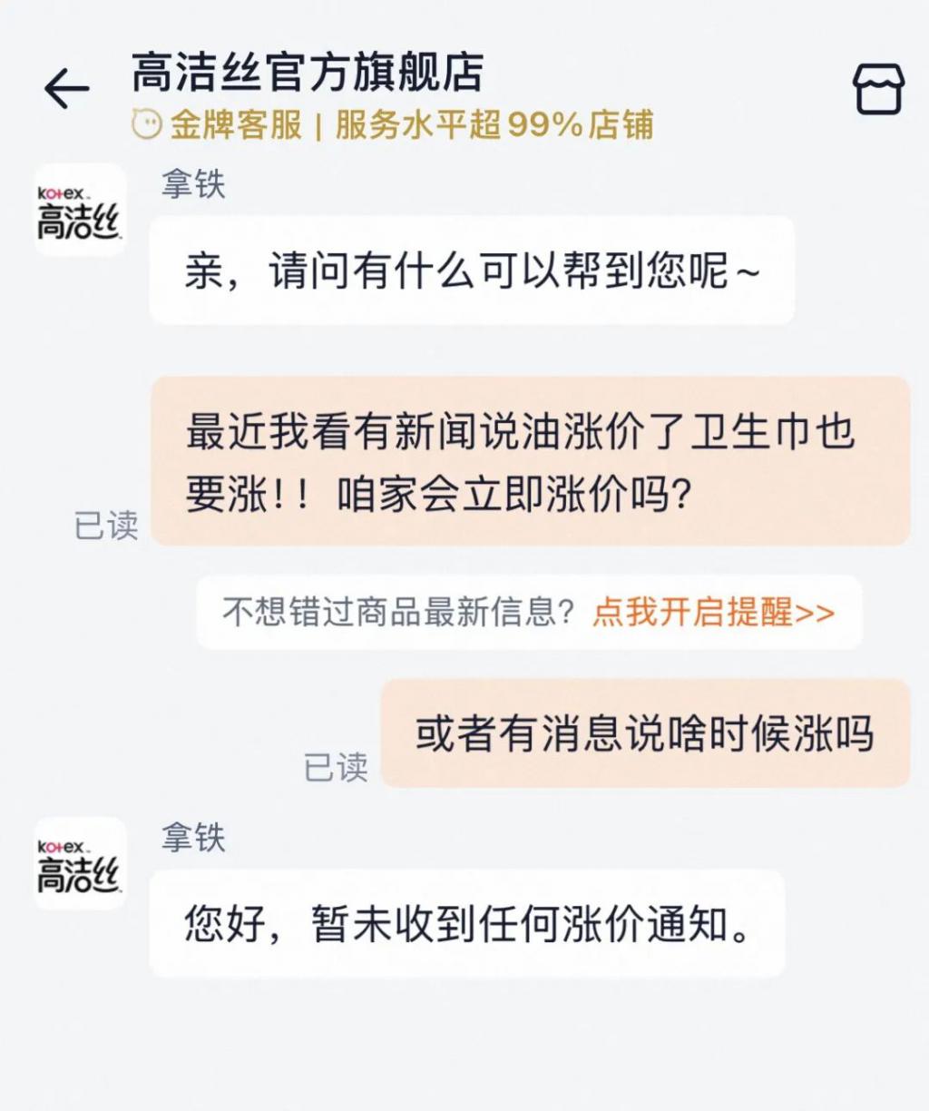 7 日,中新经纬以消费者的身份进行咨询,护舒宝、高洁丝、全棉时代、她研社、苏菲、淘淘氧棉等卫生巾品牌客服均表示,目前暂未接到价格变动的通知。