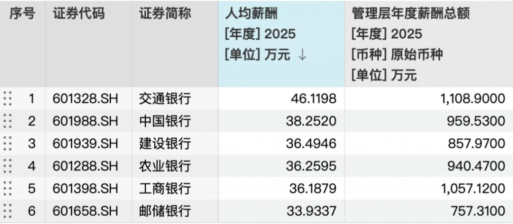 国有大行方面的薪酬 " 天花板 " 则是交通银行。Wind 数据显示,2025 年,交通银行以 46.11 万元的人均年薪领跑六大行,也是国有大行中人均薪酬唯一突破 40 万元的银行;中国银行(601988.SH;03988.HK)、农业银行(601288.SH;01288.HK)、工商银行(601398.SH;01398.HK)、建设银行(601939.SH;00939.HK)、邮储银行(601658.SH;01658.HK)的人均年薪均在 30 万元量级。