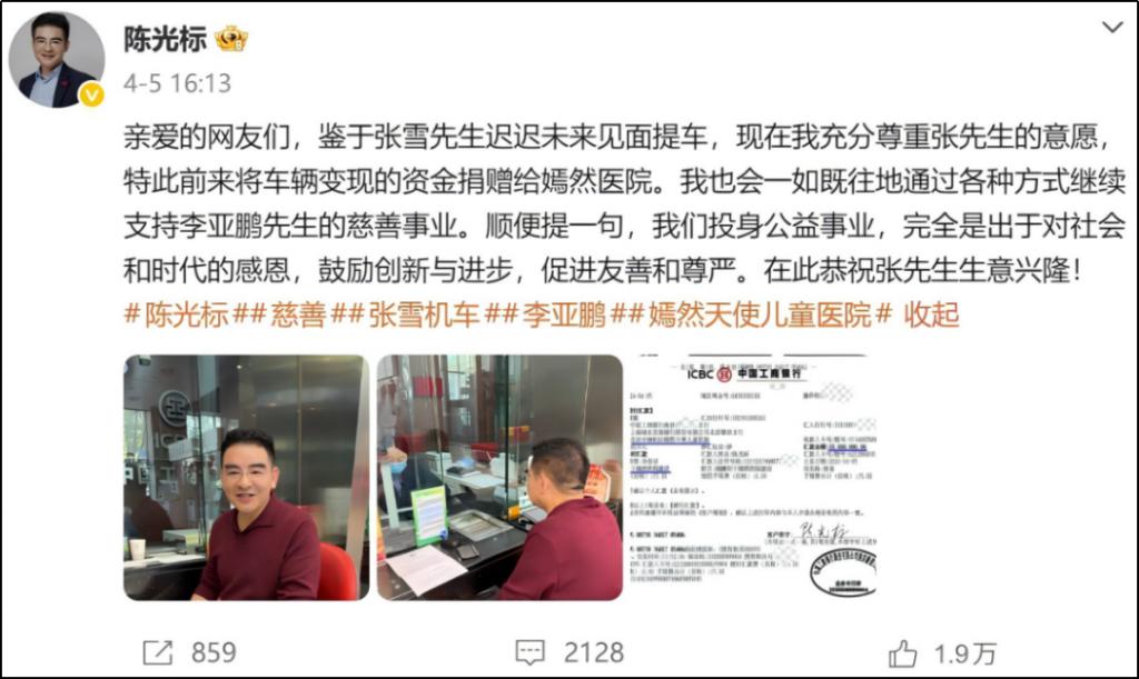 一般人觉得有免费车拿还不好吗,张雪第一时间就说不,还说会卖给回收商,然后把钱捐给嫣然医院。