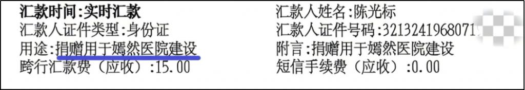 4 月 5 日陈光标晒出汇款单,里面写着他以个人名义,向嫣然医院捐款 1000 万,用以医院建设。