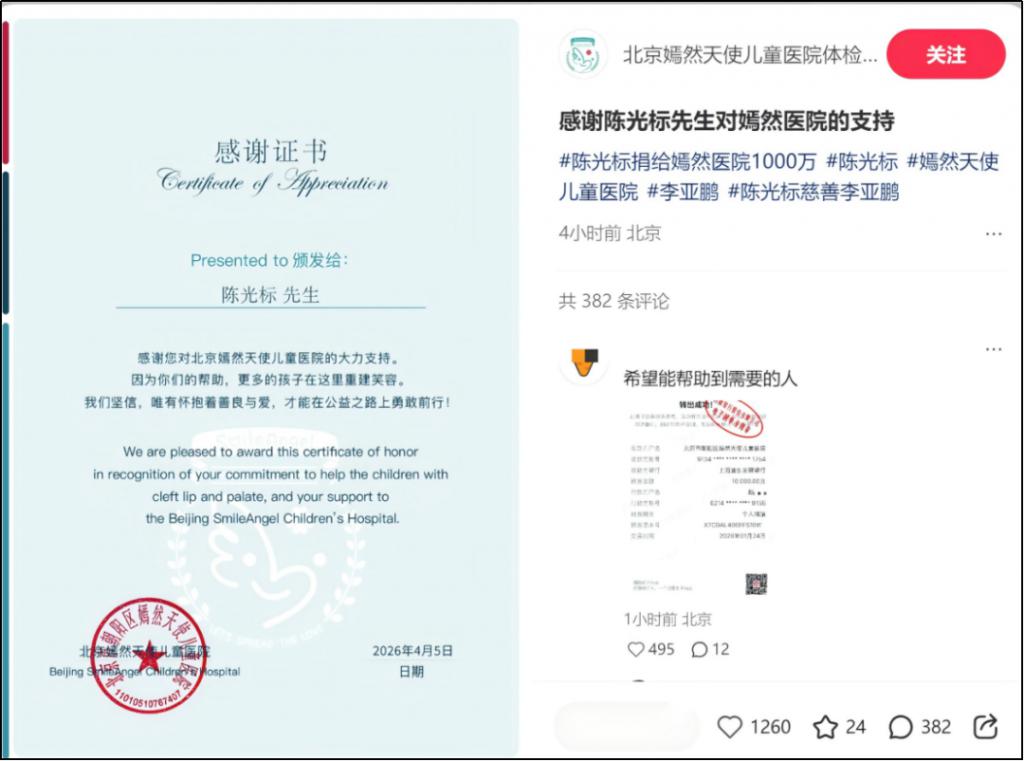 北京嫣然天使儿童医院全网宣布,收到陈光标捐的 1000 万。