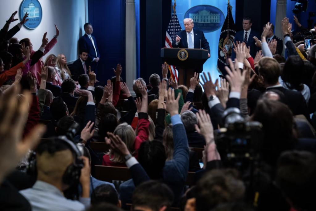 ▲周一,特朗普在白宫新闻发布会上发表讲话。(图源:纽约 · 时报)