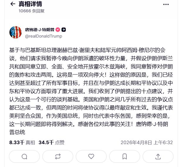 美股收盘后,特朗普又在北京时间周三早上 6 点半发表重大声明称,他同意在两周内暂停对伊朗的轰炸和袭击,而前提是伊朗同意全面、立即且安全地开放霍尔木兹海峡。伊朗最高国家安全委员会也表示,接受巴基斯坦提出的停火提议。