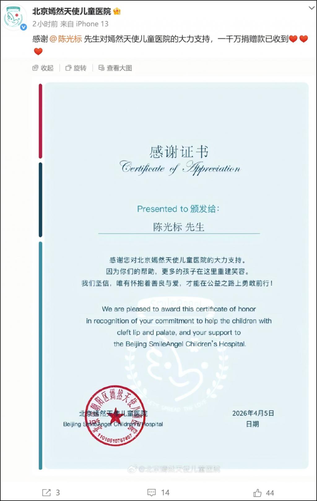北京嫣然天使儿童医院全网宣布,收到陈光标捐的 1000 万。