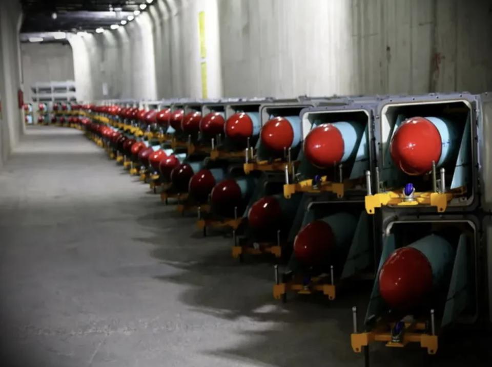 ▲伊朗 " 地下堡垒 " 内,大量导弹整齐摆放