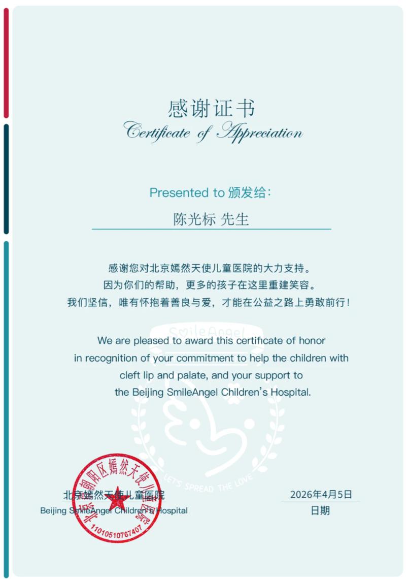 证书内文写到:感谢您对北京嫣然天使儿童医院的大力支持。因为你们的帮助,更多的孩子在这里重建笑容。我们坚信,唯有怀抱着善良与爱,才能在公益之路上勇敢前行!