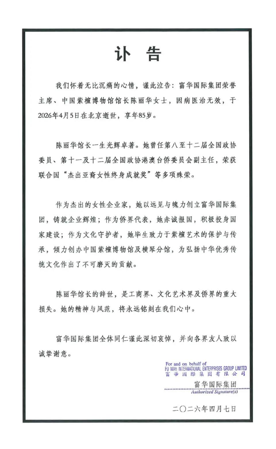 来源:富华国际集团、公开资料 原标题:《陈丽华逝世,系 86 版《西游记》唐僧饰演者迟重瑞的妻子,担任富华国际集团董事局主席,中国紫檀博物馆馆长》