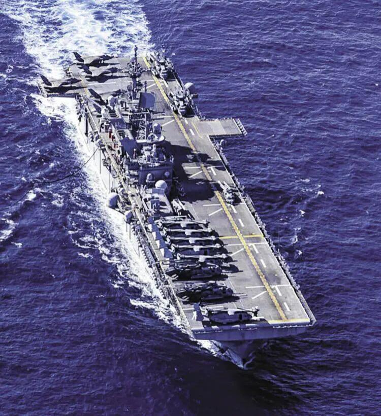 " 的黎波里 " 号两栖攻击舰载有约 3500 名水兵和海军陆战队员。它是一艘拥有全通式飞行甲板的 " 迷你航母 ",能够起降飞机。