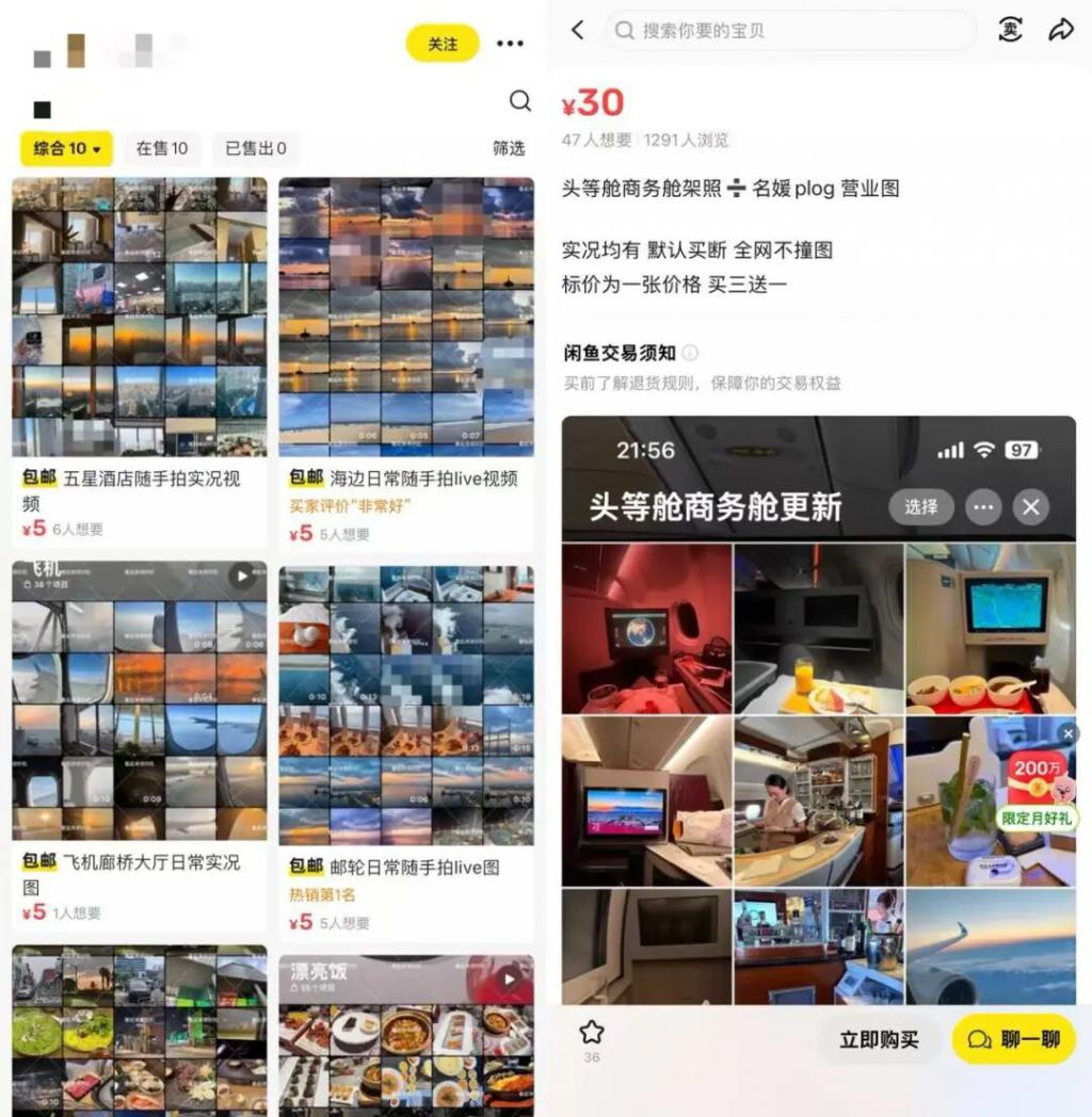 目前实况照片的售价普遍在 3-30 元 / 张,通常日常照最便宜,头等舱、高尔夫、邮轮等则价格稍高。蓝鲸新闻此前曾报道,一些卖家还接受定制代拍,按照买家要求的角度、光线、效果来拍摄,有时会配合摆放挂件、举牌等。比如定制头等舱实况图需 500 元起,指定航司可能高达 1000 元 / 张。