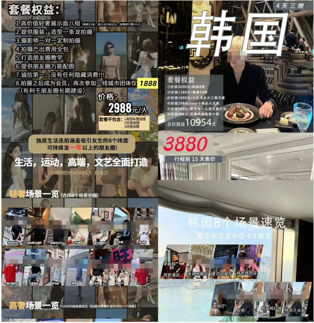 不同于组团拼单酒店和高级下午茶," 展示面拍摄 " 背后是更完整、精细化的一条龙服务。蓝鲸新闻了解到,市面上的展示面拍摄普遍报价 2000-4000 元起,提供化妆、服装造型、场地预定。这类拍摄通常包含 6-8 个场景,每个景搭配不同妆造换多个角度拍,因此商家大都宣称 " 一次拍摄包下一年朋友圈 "。