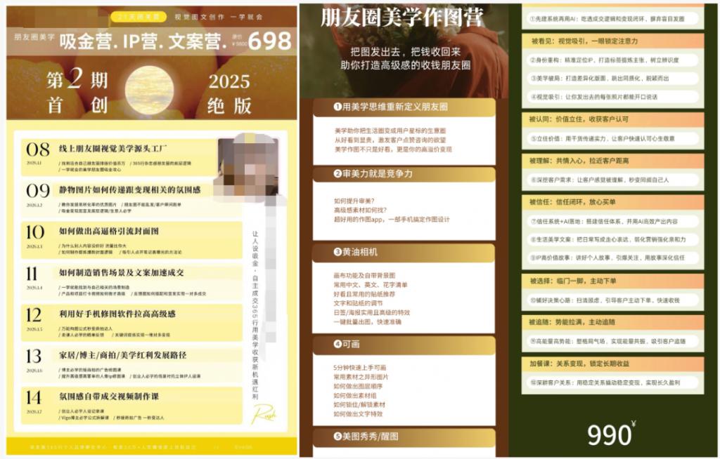因此,几百块的美学作图课仅仅只是入门砖。部分团队还会提供配套的摄影变现课、账号爆流实战营、销冠文案表达陪跑营等,售价普遍在 1000-4000 元。此外还有售价上万的年费套餐可以选择,有团队大咖一对一打造专属人设。