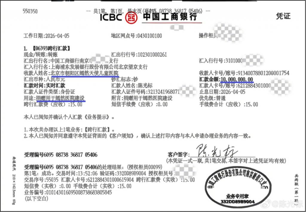 4 月 5 日陈光标晒出汇款单,里面写着他以个人名义,向嫣然医院捐款 1000 万,用以医院建设。