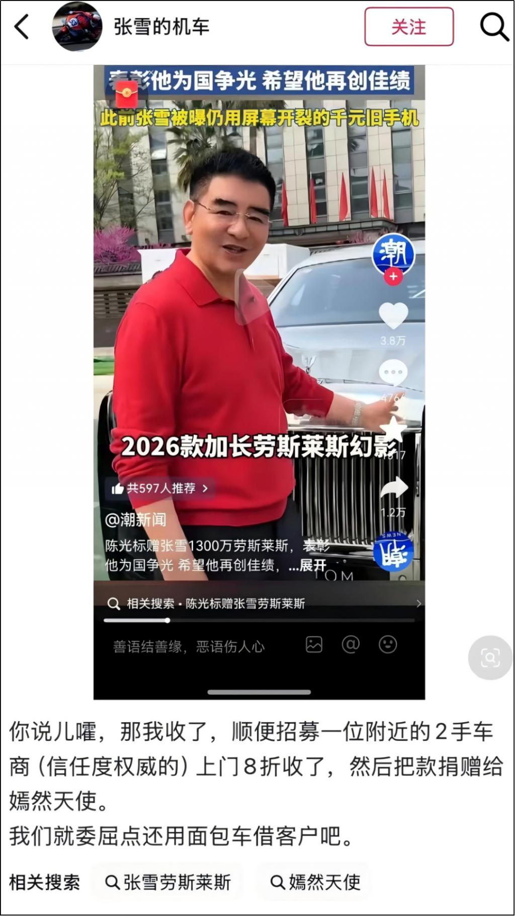 张雪爆火后,陈光标来送 1300 万的劳斯莱斯,但这事一个接一个反转。